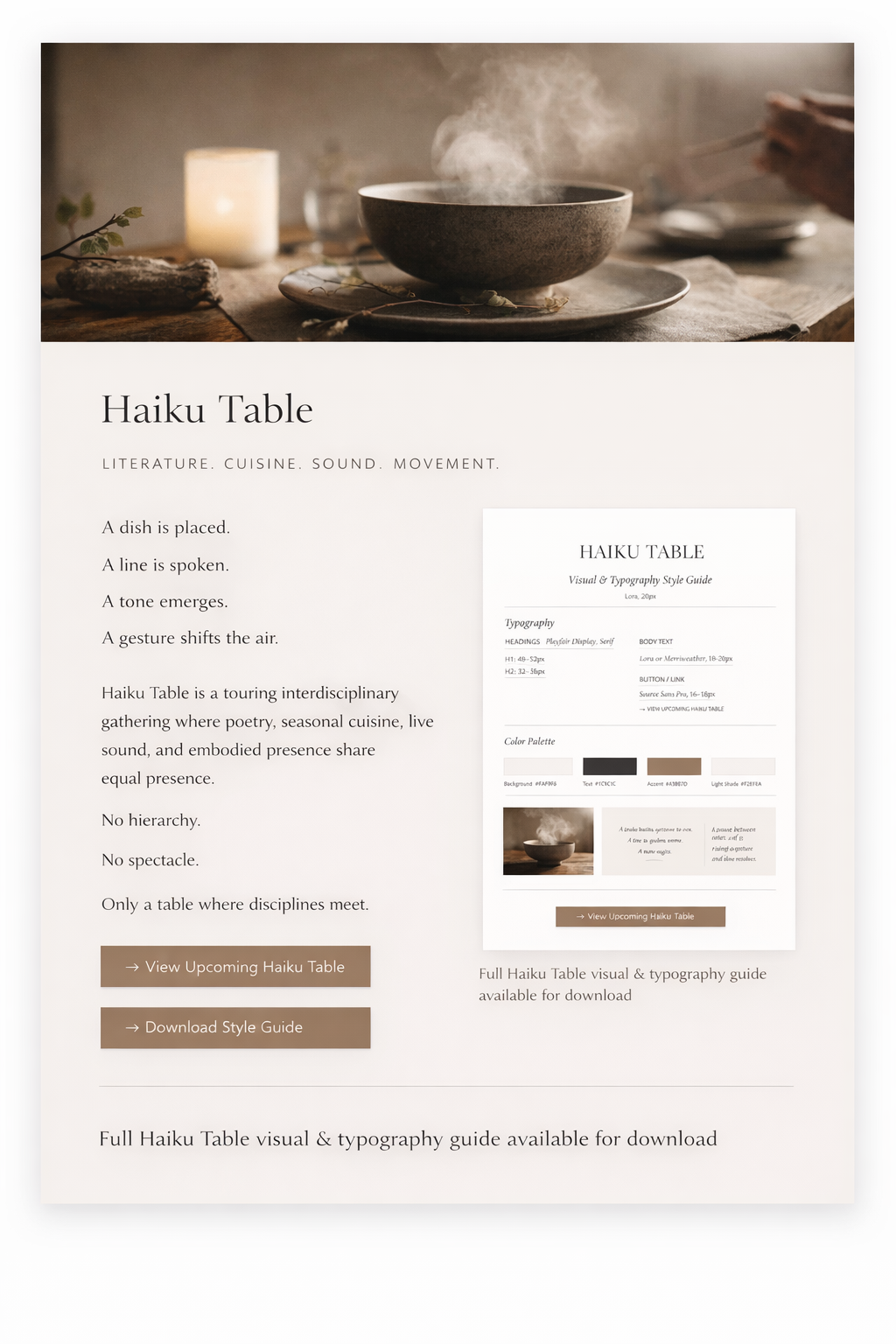 Haiku Table is a touring interdisciplinary gathering where poetry, seasonal cuisine, live sound, and embodied presence share equal presence.